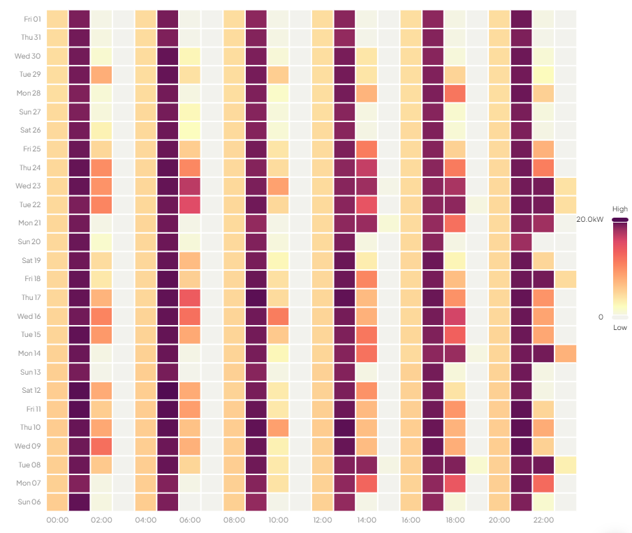 W jednym z naszych projektów analiza mapy cieplnej zużycia energii ujawniła, że osuszacz uruchamiał się regularnie także w weekendy, kiedy produkcja była zatrzymana.
